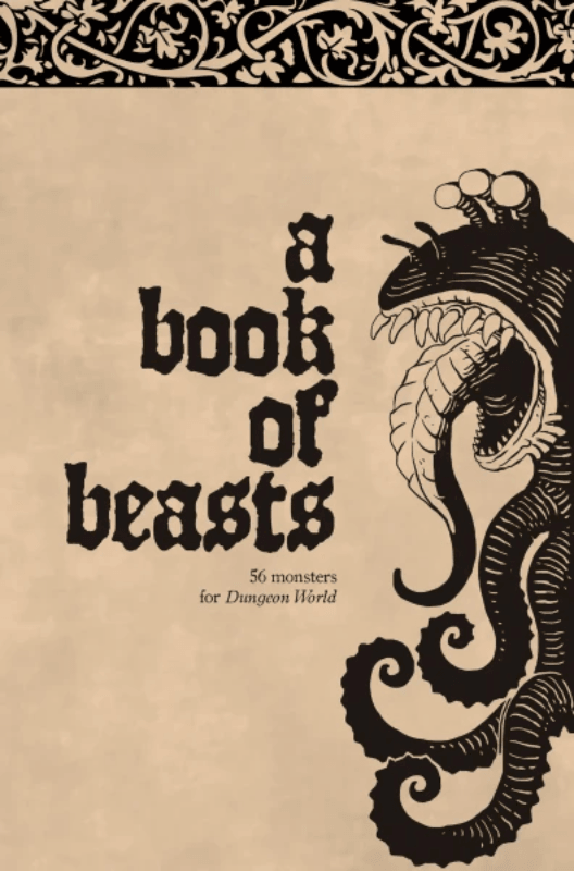56 original monsters for Dungeon World, illustrated and organized in page spreads by climate and terrain type for ease of use at the table.